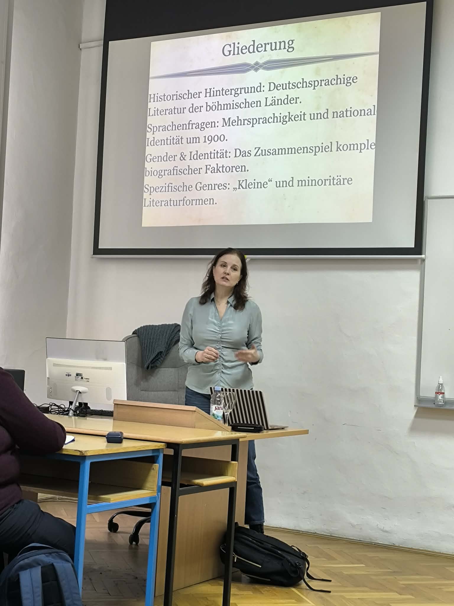 Jicinska – prednáška Published on 13 februára, 2026 in Druhá mobilitná aktivita projektu Pamäť, priestor a identita v nemecky hovoriacej literatúrePlné rozlíšenie (1536 × 2048) ← Predchádzajúci Ďalej → Mgr. Veronika Jičínská, Ph.D. z Katedry germanistiky Filozofickej fakulty Univerzity Jana Evangelisty Purkyně v Ústí nad Labem